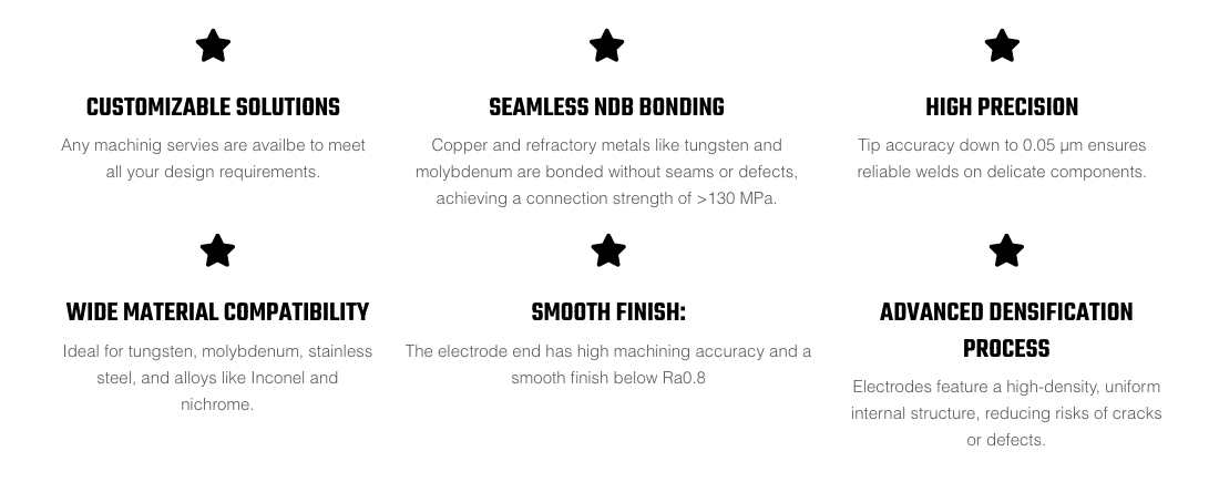 Our electrodes are built using advanced NDB bonding, delivering flawless copper-to-tungsten/molybdenum joints. This technology ensures exceptional durability, minimal defects, and consistent welding performance—even in high-production environments.